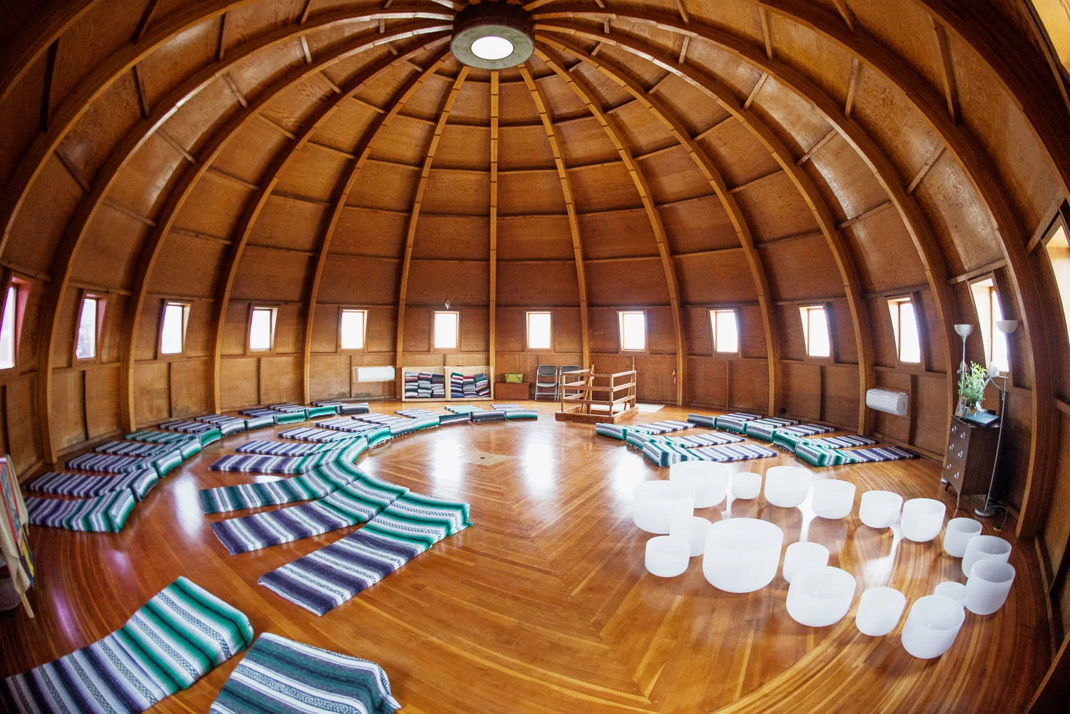 Restorative sound baths back at the retreat house featuring crystal singing bowls, Tibetan bowls, gong, chimes, and more
